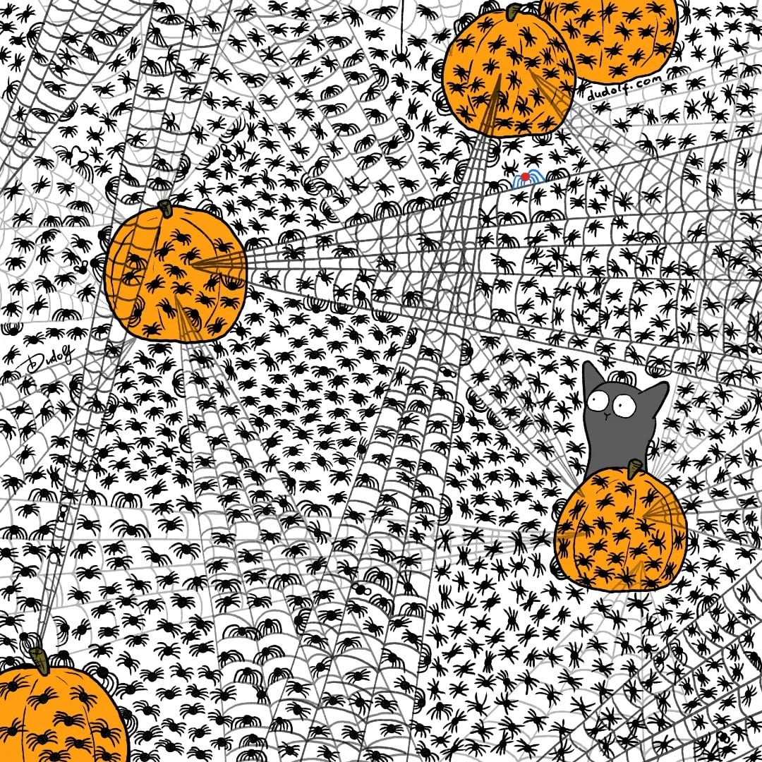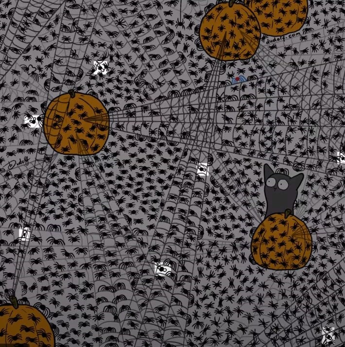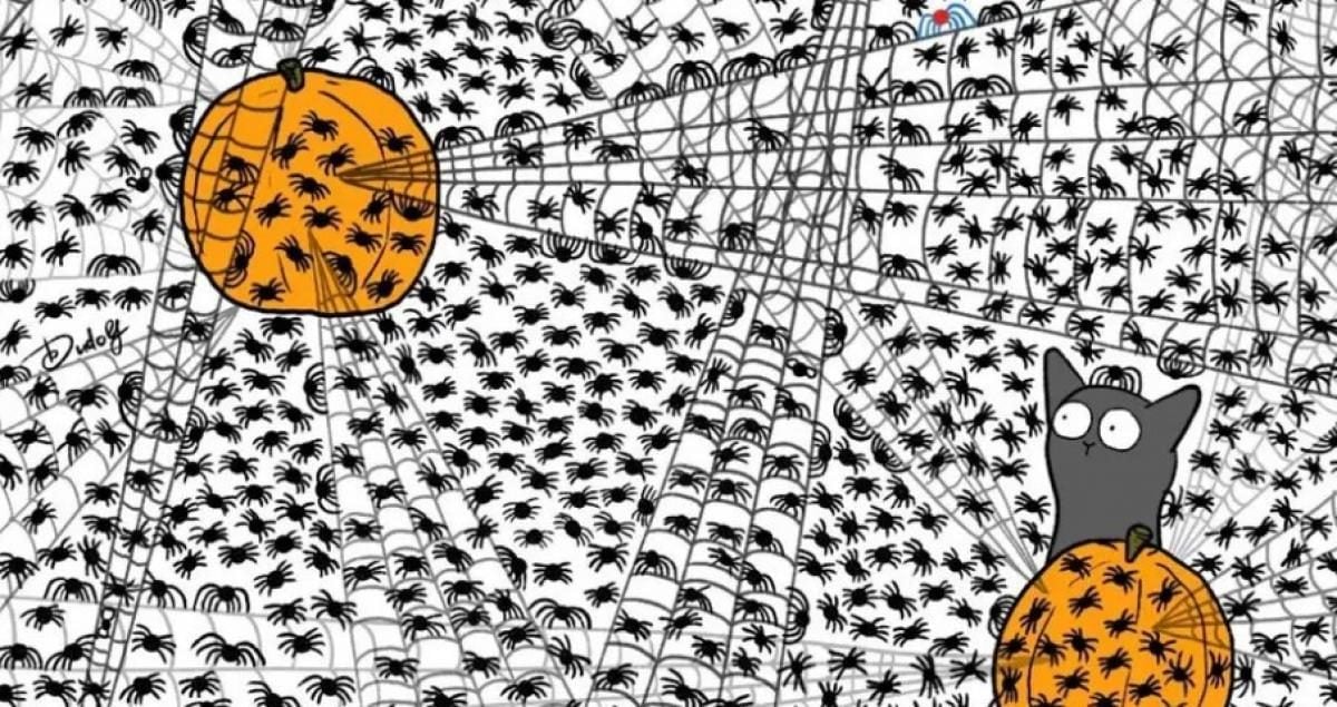 Probeer een puzzel op te lossen die ongelooflijk populair is geworden op internet – je moet snel vliegen vinden in een afbeelding met pompoenen en veel spinnen.