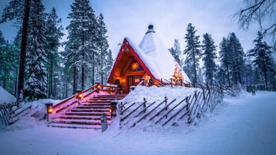 Op de afbeelding zie je een huis, waar je via een grote ladder naartoe moet klimmen. Rondom het huis is een naaldbos, de takken van de bomen zijn gebogen door de grote hoeveelheid sneeuw. Buiten het huis schijnen lampjes en het hele erf is bedekt met een dikke laag sneeuw, die het hek bijna helemaal bedekt.