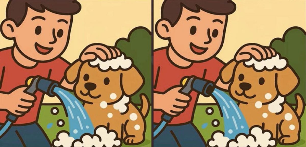Klaar om je oplettendheid te testen? Kijk eens naar deze twee afbeeldingen van een jongen die zijn hond in bad doet. Op het eerste gezicht lijkt het misschien alsof de foto’s precies hetzelfde zijn, maar er zitten eigenlijk drie kleine verschillen tussen.