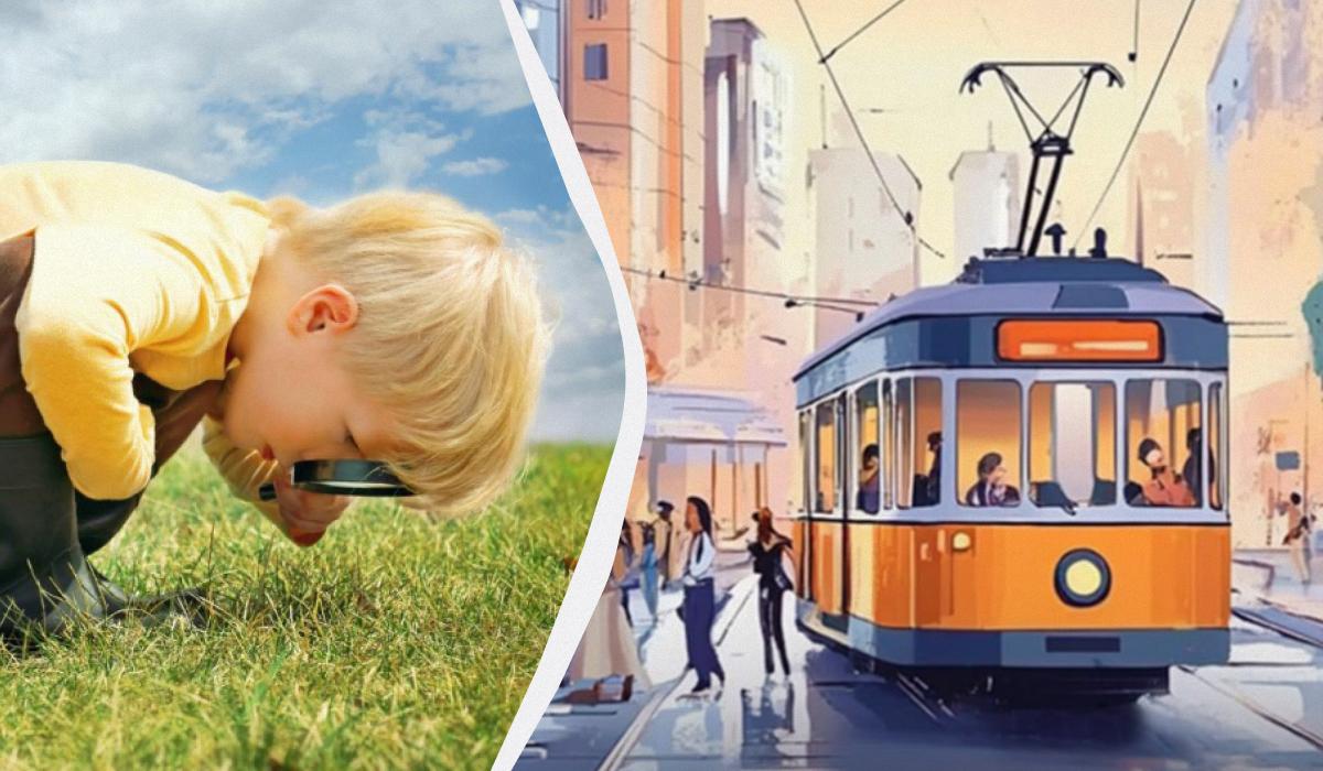 De afbeelding toont een drukke straat waar mensen langs lopen en een gewone tram rijdt. Je moet een timer instellen voor vijf seconden en erin slagen de fout te vinden voordat de tijd om is. Klaar?