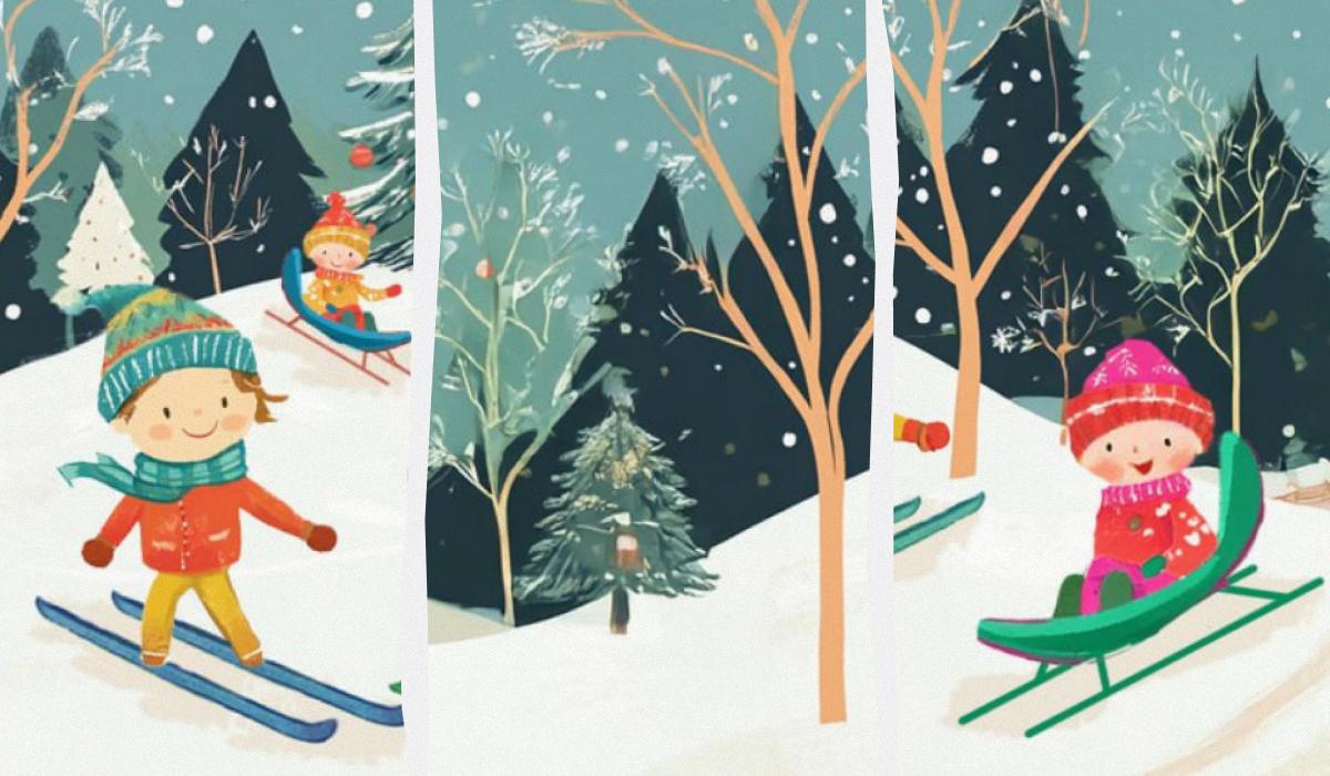 Voor je zie je een groep blije kinderen die genieten van de sneeuw en het echte winterweer in het bos. De kleintjes zijn aan het sleeën en hun oudere vrienden zijn aan het skiën.