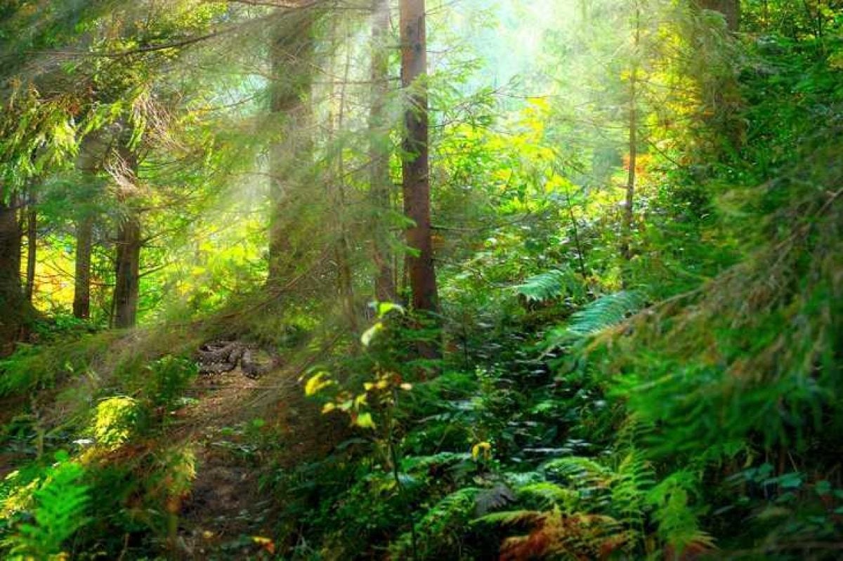 De afbeelding laat een dicht groen bos zien. Ergens verstopt zich een slang, die we moeten vinden.