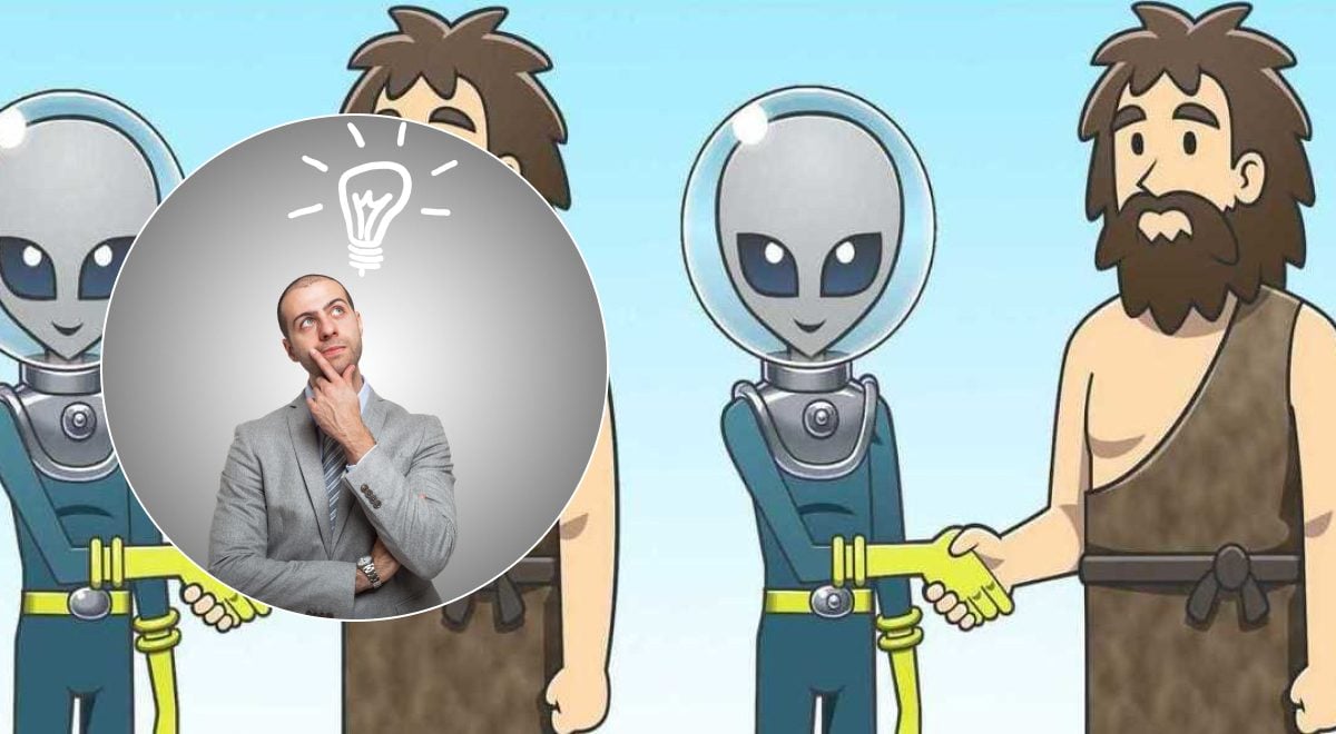In de afbeelding zie je twee identieke aliens en twee holbewoners.