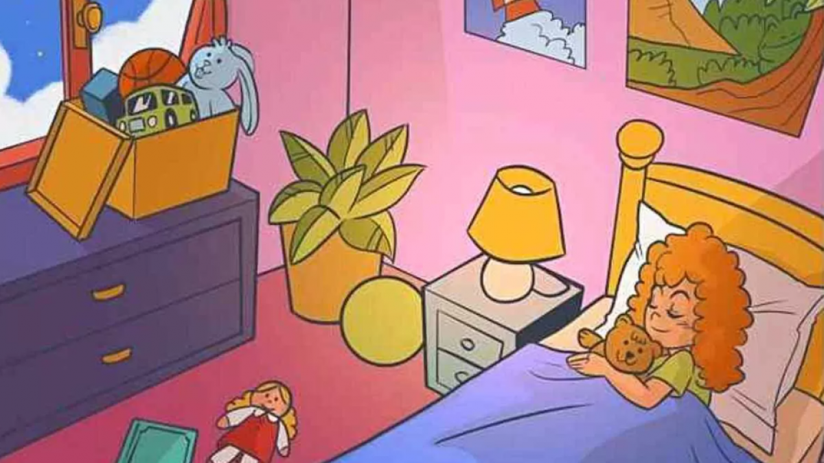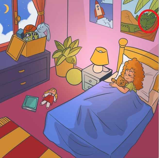 Kon je de kikker niet vinden? Hier is een hint – hij staat op de foto boven het bed van het meisje.