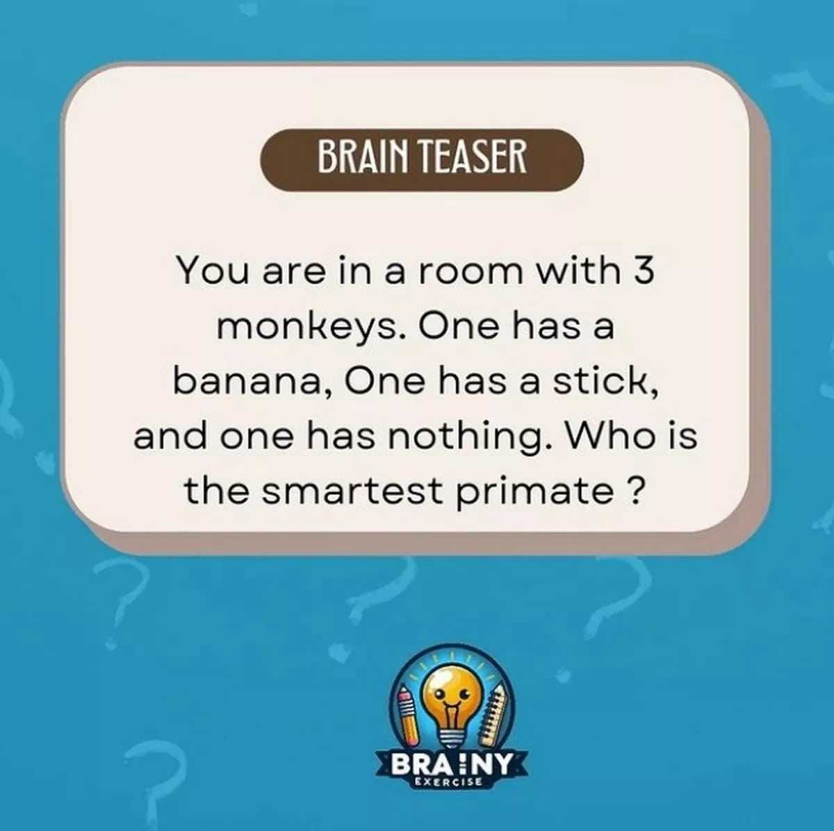 The Mirror heeft er een gepubliceerd, met slechts 30 seconden om op te lossen, en het raadsel gaat als volgt: “Er zijn drie apen in een kamer. De eerste heeft een banaan, de tweede een stok en de derde heeft niets. Wie is de meest intelligente primaat?”