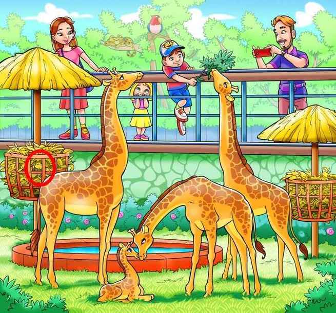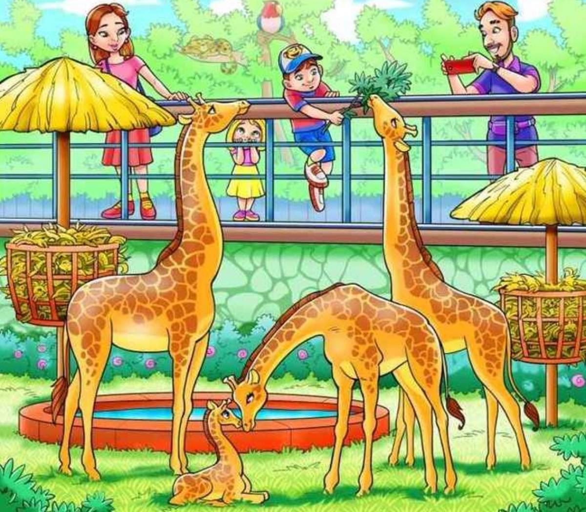 De foto is van een gezin in de dierentuin. De man filmt de giraffen met zijn telefoon en de kinderen en zijn vrouw kijken naar de dieren. Er zit ergens een aap verstopt, die je moet vinden.