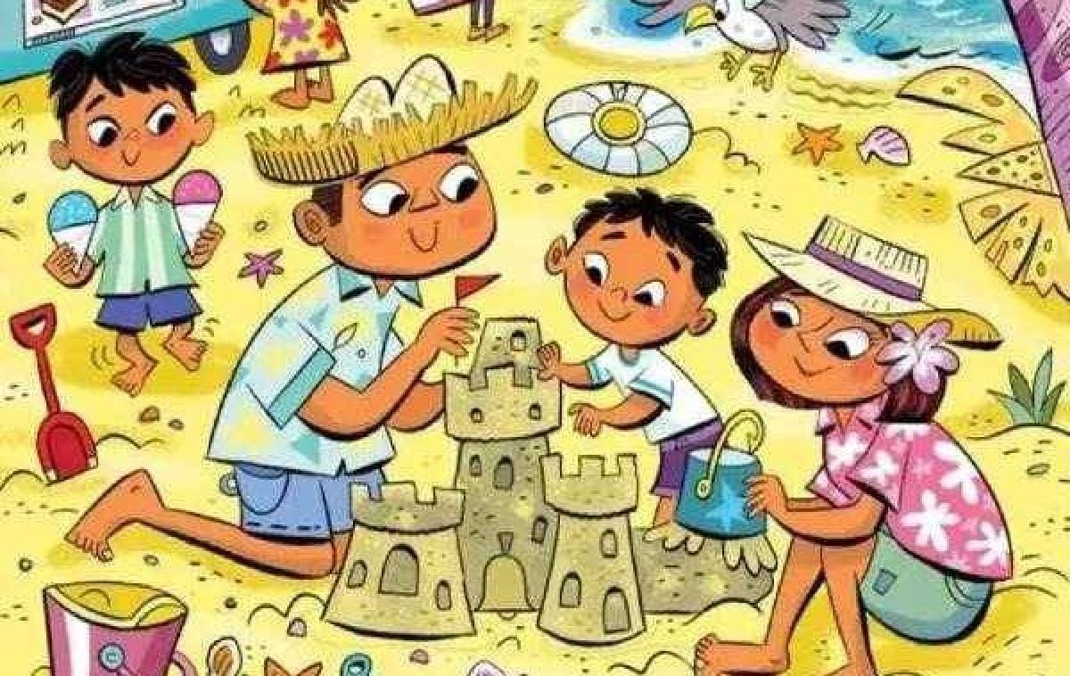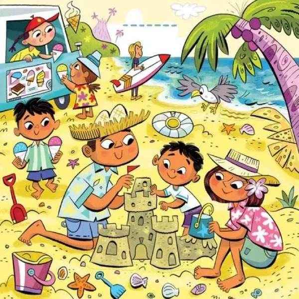In de afbeelding zien we een interessant plot – papa, mama en hun kinderen rusten uit op het strand en bouwen een zandkasteel. Twee kinderen – een jongen en een meisje – renden om een ijsje.