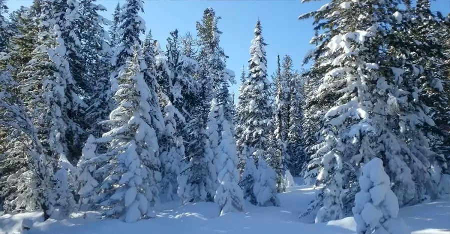 De foto toont een naaldbos in de winter. De bomen zijn zo besneeuwd dat bij de meeste de takken naar beneden leunen door het gewicht van de winterse sneeuwvlokken. Ook de grond is bedekt met een dik pak sneeuw.