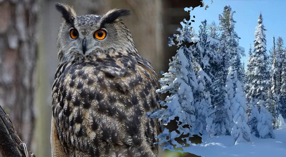 Zoek een uil in het bos in 16 seconden / collage: Glavred, foto: fresherslive, unsplash.com