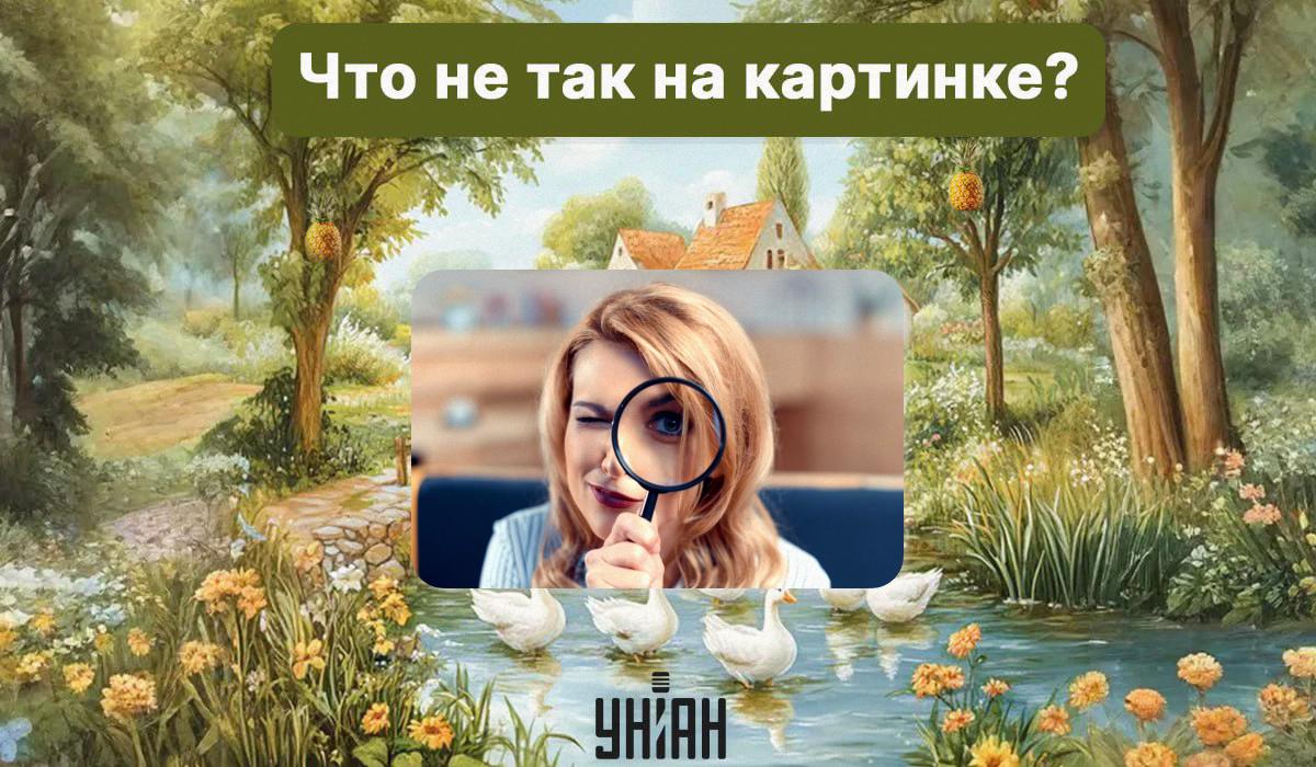 Hieronder zie je een afbeelding van een huis, bomen en een vijver. Het lijkt een prachtige sfeer, een interessant idee van landschapsontwerp. Maar iets op deze afbeelding is niet zo. En het is jouw taak om vast te stellen wat dat is.